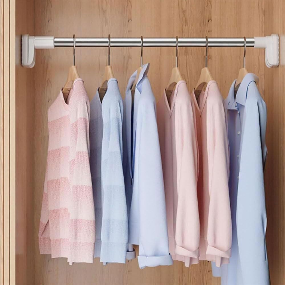 You can freely combine the rods' placement so that closets or shelves will have more space. Easy to use, no screws required, rubber tip to protect closets and never no holes.